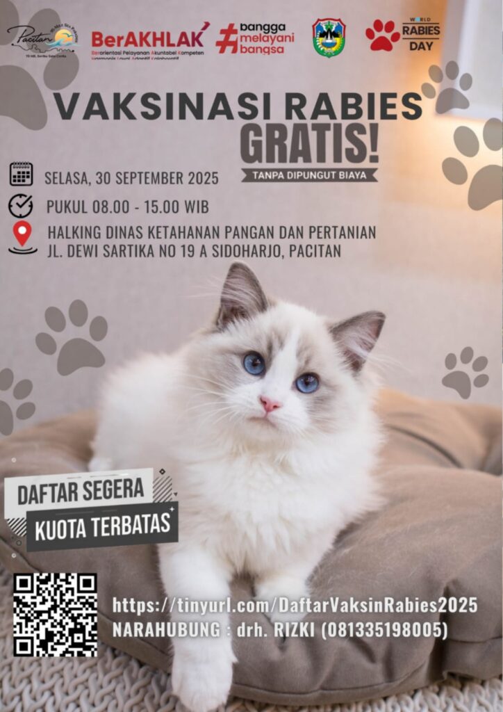 Dinas Ketahanan Pangan dan Pertanian Kab. Pacitan menyediakan vaksinasi rabies gratis untuk hewan menular, jangan lewatkan kesempatan ini.